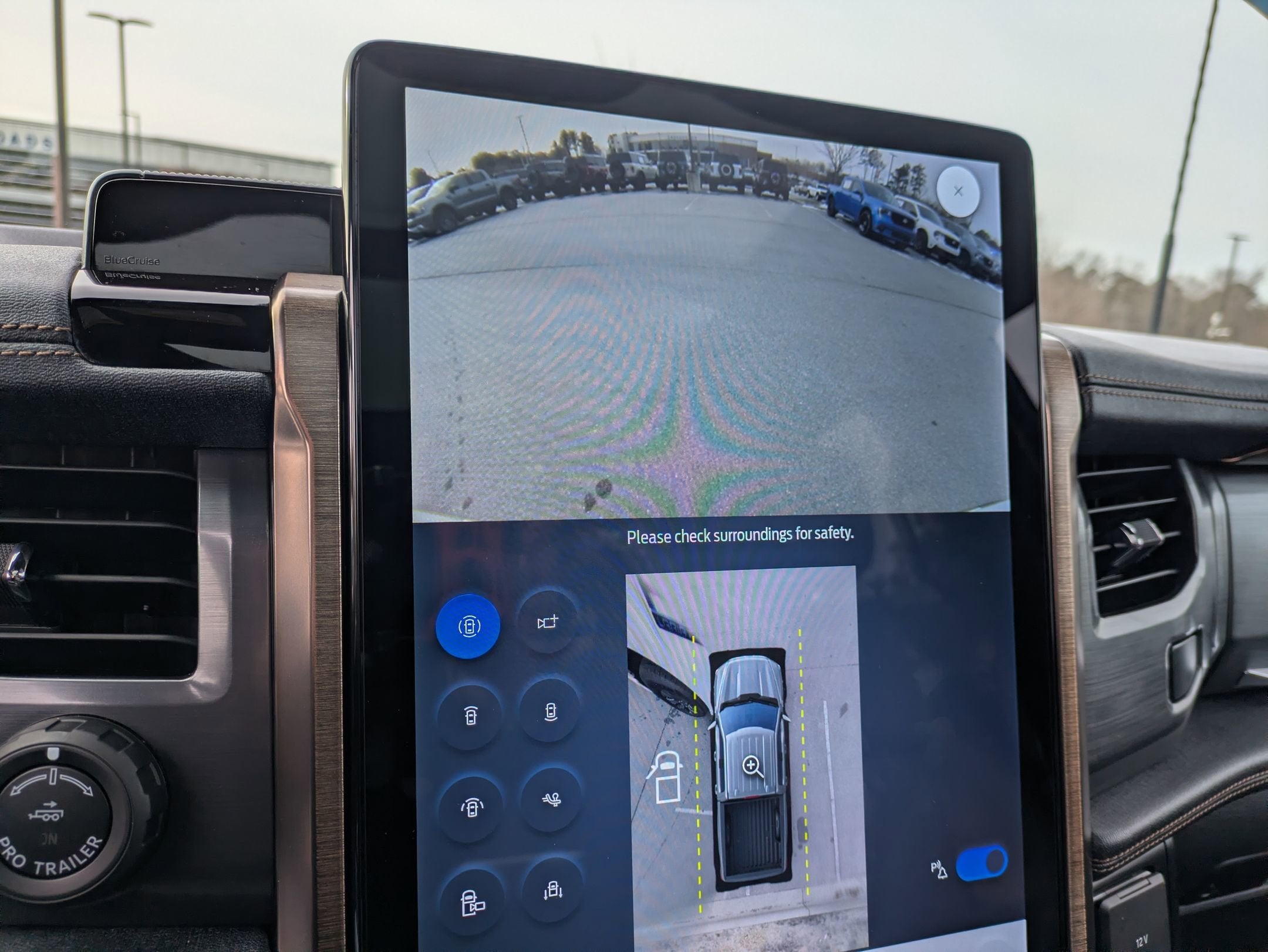 Safety and driver assistance are managed by the Ford Co-Pilot360 suite, including BlueCruise (90-day trial) for hands-free highway driving. Additional advanced features include a 360-degree camera, Intelligent Adaptive Cruise Control, Evasive Steering Assist, and a Lane-Keeping System.